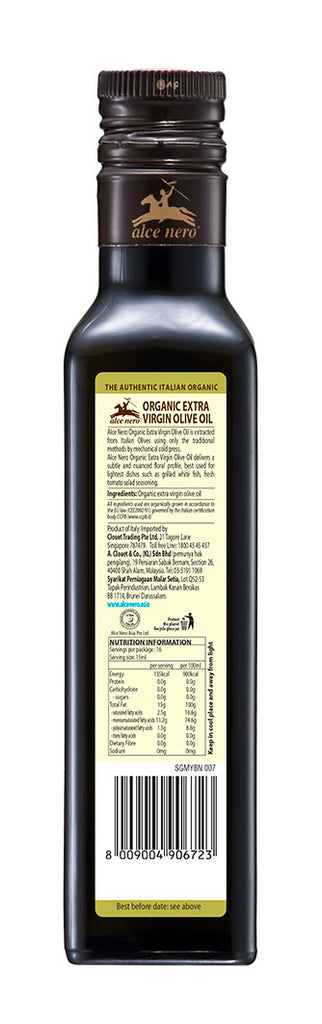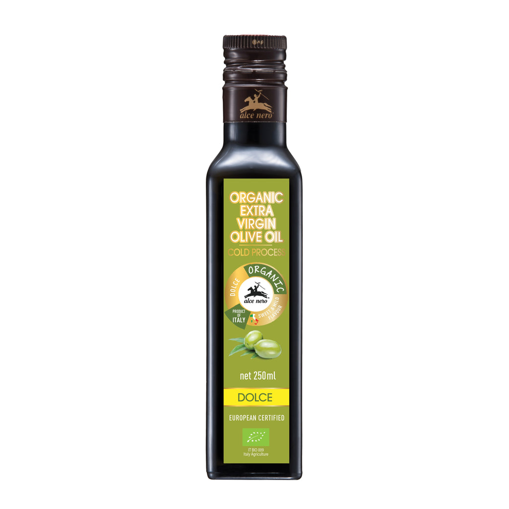 The extra virgin olive oil of Alce Nero is produced exclusively with organic olives of Italian varieties, mostly Coratina, Ogliarola and Carolea which give a green oil with yellow hues and balanced taste.