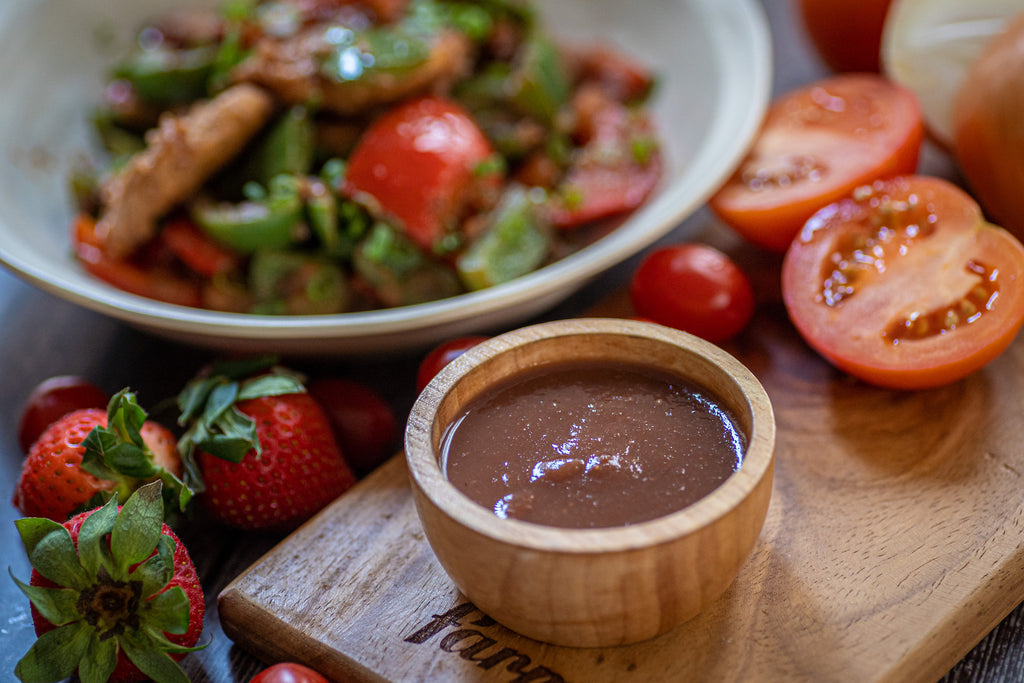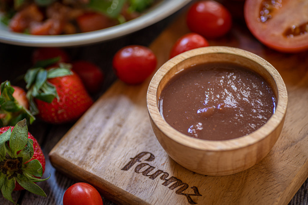 Ingredients: Tomatoes, Strawberries, Onions, Balsamic Vinegar, Coconut Palm Sugar, Bay Leaf, Lemon Juice, Himalayan Pink Salt