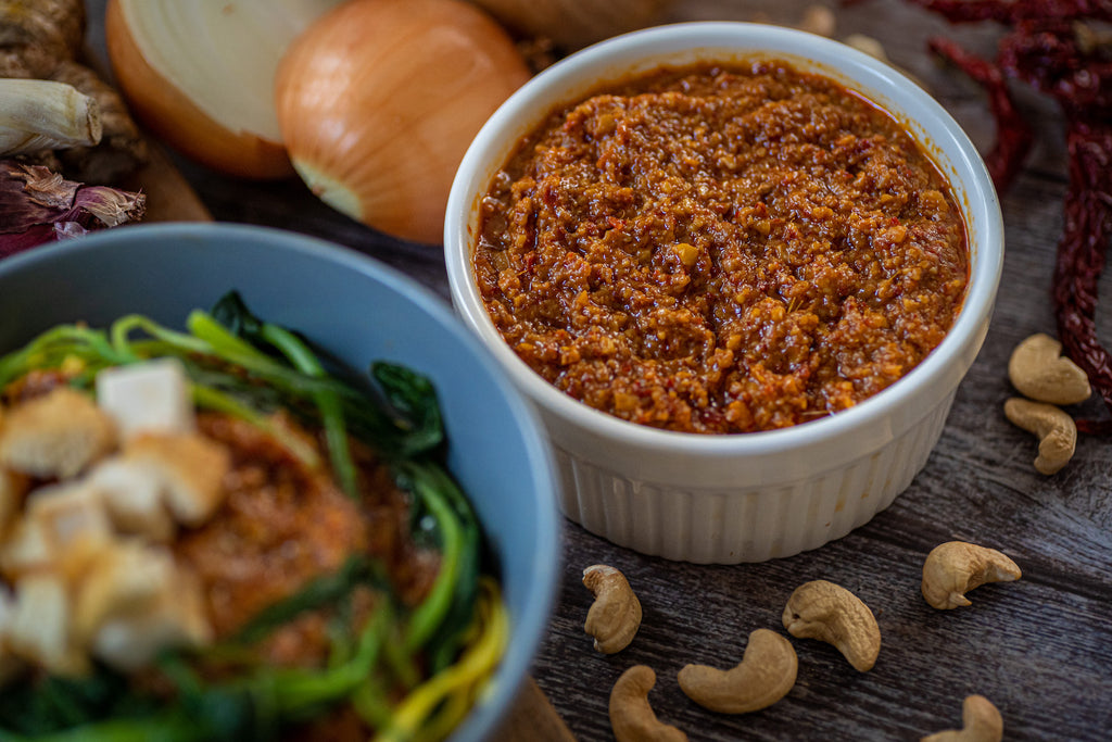 Ingredients: Cashew Nuts, Dried Chilies, Shallots, Garlic, Galangal, Ground Coriander, Lemon Juice, Coconut Palm Sugar, Tamarind Juice, Himalayan Pink Salt, Filtered Water, Olive Oil, Sesame Oil, Chili Powder