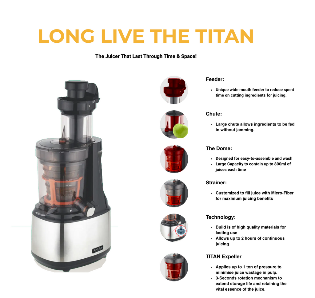 Titan Pro Series Juicer comes with a 1 full year warranty for Motor Replacement excluding wear & tear.